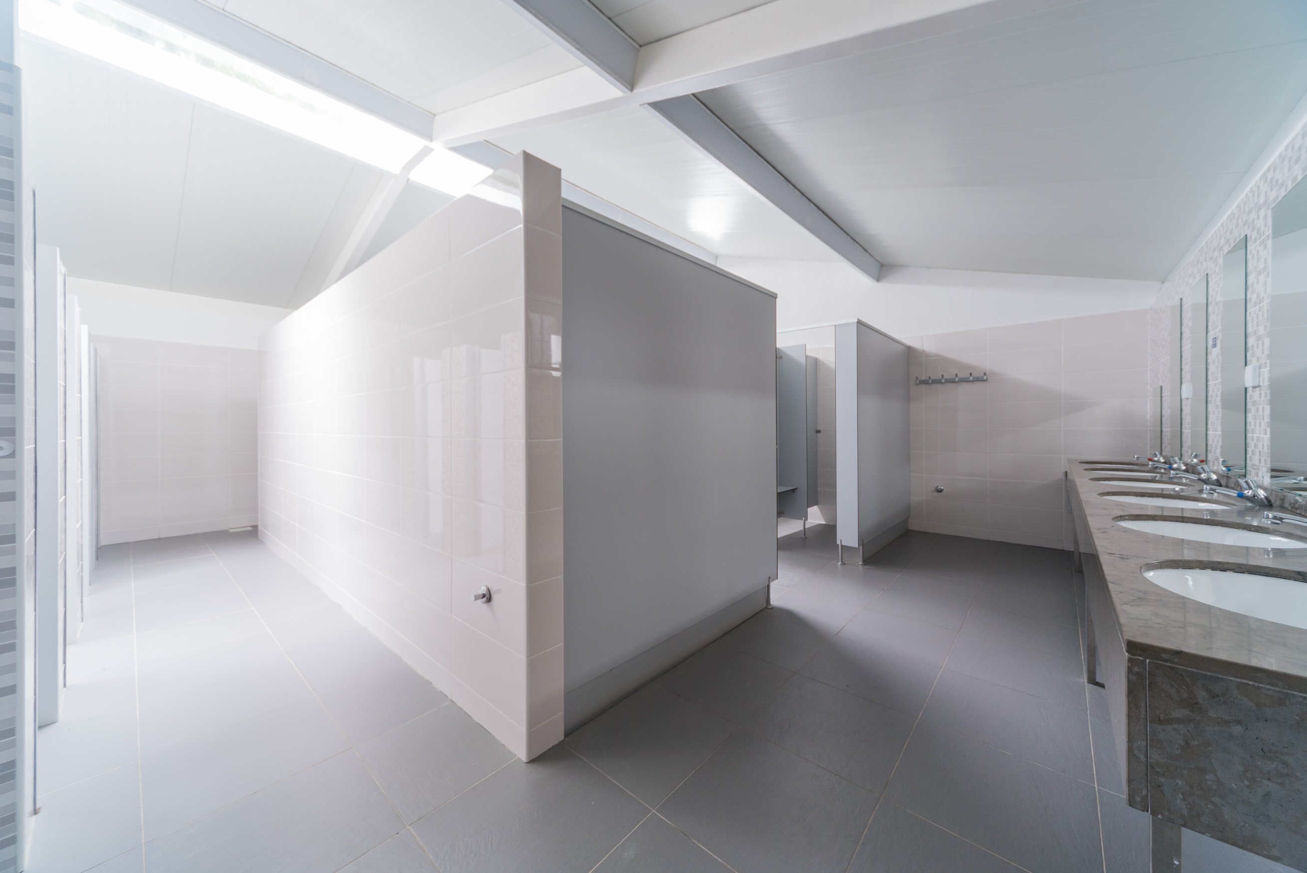 Hébergement collectif, chambres avec lits superposés et salle de bain.